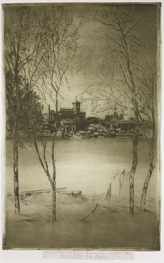 Executed 1889-90, this etching is also known as Laburnums and Battersea, Corner of the New Bridge White in Construction. The pile of sand in the foreground is presumably for the work on the construction of new Battersea Bridge, the old bridge having been demolished in 1879. Versions are in the collection of the British Museum, London and Museum of Modern Art, New York. This print was a gift from the artist to his favourite model, Hetty Pettigrew. She most notably sat for his 1886-7 oil The Reading Girl (Tate Gallery) but she also sat for Whistler, Holman Hunt, Millais and others.