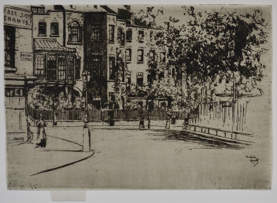 Battersea from Chelsea was executed c.1888-9 in a total of about 30 impressions. It was probably drawn from the Greaves boatyard at Lindsay Wharf. The subject is the corner of Beaufort Street and Cheyne Walk, seen from the Chelsea End of Battersea Bridge. The Georgian house, with a veranda on the second floor if Belle Vue Lodge, next to it is Belle Vue House and to the right of that is Lindsey Lodge. Examples are in the collections of the Rijksmuseum, Amsterdam; British Museum, London and National Gallery of Art, Washington.