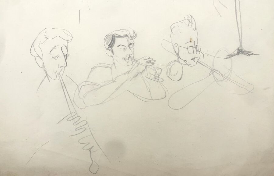 Minton was a frequenter of jazz bars in Soho and a flamboyant figure in the neighbourhood’s night life. This swift sketch, probably made on the spot, may relate to a design Minton created for the left-leaning arts magazine Our Time in the summer of 1949 (see fig.1).