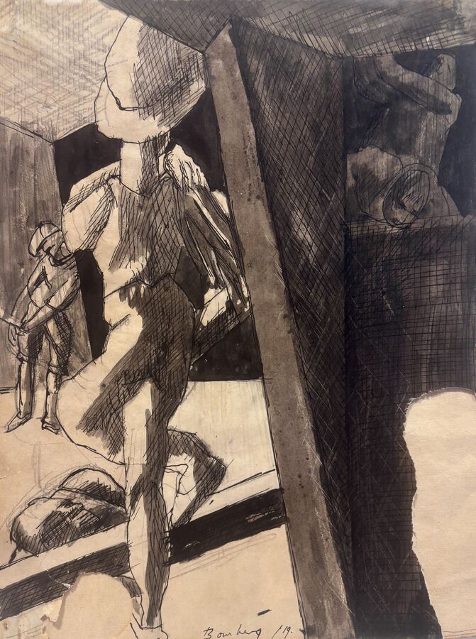 Towards the end of the First World War, Bomberg was commissioned by the Canadian War Memorials committee to paint a tribute to a Canadian company of sappers from the Royal Engineers who died tunnelling under St Eloi on the Western Front in 1916. An initial more futurist version of the event was rejected, but the final painting (a study of which is in the Imperial War Museum (acc. ART 2078)) is full of the energy and geometric form that characterises the best of his futurist and vorticist-inspired work of the 1910s. The present work is a strong example of one of the artist’s studies for this commission.