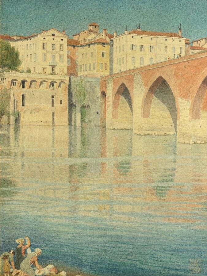 Southall and his wife made an Autumnal trip to France in September and October 1929 – taking in Paris, Lille, Cahors, Cordes and Albi. The particular seasonal light of Southern Europe greatly appealed to him – as is so evident in the beautiful Autumn glow of the present watercolour, which depicts the southern French town’s great medieval bridge from below. A similar work, but from a higher vantage point across the river, was acquired by Southall’s fellow Birmingham Quaker and philanthropist, Paul Strangman Cadbury, in 1930.