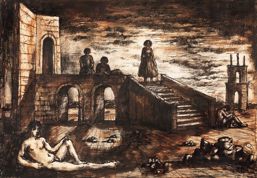 Aware that Eugene Berman had painted at Les Baux, the ancient ruined town perched on a rocky outcrop in Provence, Minton and Ayrton determined to visit it. His experience of Les Baux allowed a number of influences in Minton’s art to coalesce. Here he found a terrain in which he could explore the ominous silence that the Italian surrealist George de Chirico had created. Likewise, Minton makes his vistas tense by strewing the foreground with shards of rock and sharply etched shadows. The unending space is often offset by a foreground figure in tattered clothes, either standing or asleep, whose wistful beauty is reminiscent of Berard’s paintings of back-street waifs. There is also something of Tchelitchew in the mood of otherworldliness, whilst Berman’s example may have inspired Minton’s choice, in his paintings, of tenebrous colouring.