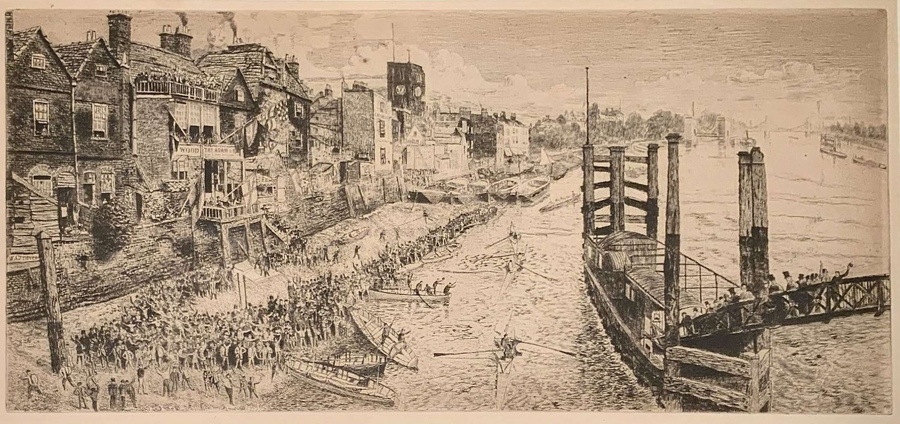 The scene, full of vivid incident and a characterful multitude of figures, is a depiction of the last traditional rowing regatta which took place in Chelsea in the summer of 1871. If the viewer follows the line of the Thames towards the horizon, the partly completed Albert Bridge (opened in 1873) can be identified spanning the river before Chelsea Bridge is reached (still known as Victoria Bridge at this stage). Bailey's Magazine of 1890 discusses how "Chelsea Regatta always attracted a numerous company, and under the old elms that grew on each side of Cheyne Walk, fun and sport of all kinds would be carried on."[1] The regatta used to be one of the highlights of the year in the Chelsea of old; Walter Greaves described how "what with guns firing, flags flying, bands playing and the immense crowd of people, Chelsea was pretty lively on the occasion of its annual Regatta. The 'Adam & Eve', the headquarters of the sports, was crammed with people, and one wondered how it stood the strain of such a weight being a very old building... This regatta, like the other river races made a remarkably artistic display of colour especially as it took place on a fine summer’s day, with blue skies and white clouds."[2] Greaves made several works relating to this event: an oil, now in the collection of Manchester City Art Gallery[3]; a watercolour of the same view, but without the crowd and a hand-coloured version of this etching.[4[.