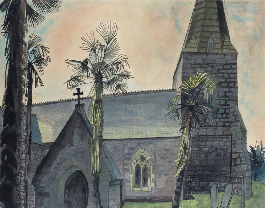 Later in life Bawden made annual trips to Cornwall where he stayed in Rose Cottage in St Ewe, some five miles from St Austell. In the churchyard at All Saint’s he found a gravestone of his namesake which read “Edward Bawden, died 29th October 1894. Aged 68 years. His End Was Peace.” There is a photograph by his friend Christopher Brown of Bawden leaning on it. Malcolm Yorke has written of late watercolours like the present work: “These landscapes of Bawden’s maturity have come an astonishing distance from those early tentative ones he made sitting beside Ravilious… Now he works big and bold, taking liberties with his compositions… he sits close to a building so its perspective soars away from him… (or) to draw every flint on a church exterior or to put a square outline round every leaf… These are the playful but highly effective strategies of a man in total control of his medium.” (Malcolm Yorke, Edward Bawden and His Circle, Antique Collectors’ Club, 2007, pp.240-41)