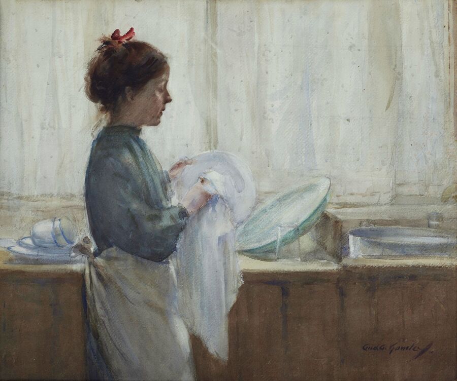 Gamley, the younger brother of the sculptor Henry Snell Gamley RSA, became the first recipient of the prestigious Royal Scottish Academy Carnegie Scholarship in 1903. The result of this award was a trip to France, where he took afternoon classes at the Academie Julien under Jean-Paul Laurent. Whilst here, Gamley also took time to assimilate international modern art of the period including at the Pantheon where he noted “the great decorations by Puvis de Chavannes”. Gamley’s copy of one of Puvis de Chavannes’s paintings there is now in the collection of the Royal Scottish Academy (acc.1992.224). Much of Gamley’s other work touches on European art of his period, including this fine domestic scene which has something of the character of Scandinavian art and painters like Vilhelm Hammershøi. Gamley later established himself as a portrait and landscape painter and was vice president of the Royal Scottish Watercolour Society.