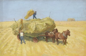 The picturesque hilltop village of Anticoli Corrado, some forty kilometres from Rome, has provided a natural retreat for artists throughout history. A group of painters that particularly claimed the village as their own were the winners of the prestigious Prix de Rome, awarded each year from the early 1920s, and for which Nixon was first ever recipient in the discipline of engraving in 1923. Whilst many of his contemporaries took their impulse from the village's architecture, or its ideal setting for the kind of Piero della Francesca-influenced Allegorical scenes favoured by the Rome School artists, Nixon found his inspiration in real people, as in the present work - farm workers involved in the hard manual toil of the land. Despite echoes in the work of artists such as Millet and Clausen, Nixon's execution is very much his own, also revealing him to be an exceptional draughtsman. Later Nixon settled as part of the community in Newlyn, gaining a reputation as a true Bohemian and being drawn to another human subject, that of the Romany gypsies. Although best known as an engraver he had considerable success as a painter and watercolourist, exhibiting widely at the Royal Watercolour Society and at the Royal Academy where he exhibited thirty six works.