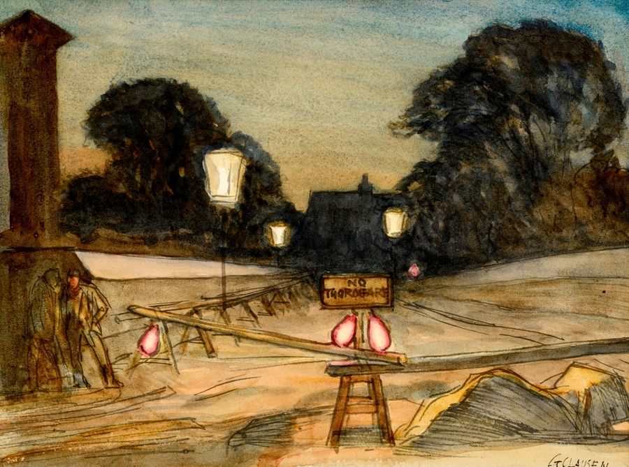 Following Clausen’s move to St John’s Wood in north London in 1905 he embarked on a series of Whistlerian nocturnal subjects, including views of houses at night and atmospheric depictions of the London skyline. It is likely that this unusual roadblock scene is one such London subject and dates from the latter half of the artist’s career.